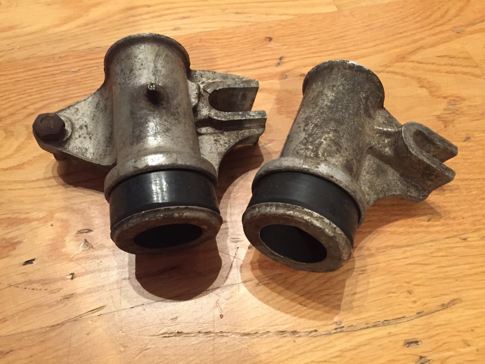 The washer on the bottom of the bush has a bevel to it so I quickly sanded a matching chamfer onto the rubber using a disc sander. I didn't get a pic of this but here they are assembled into the castings with the old rubbers in front
